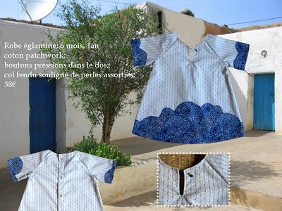Robe de cotons patchwork, col fendu soulignéde perles assorties